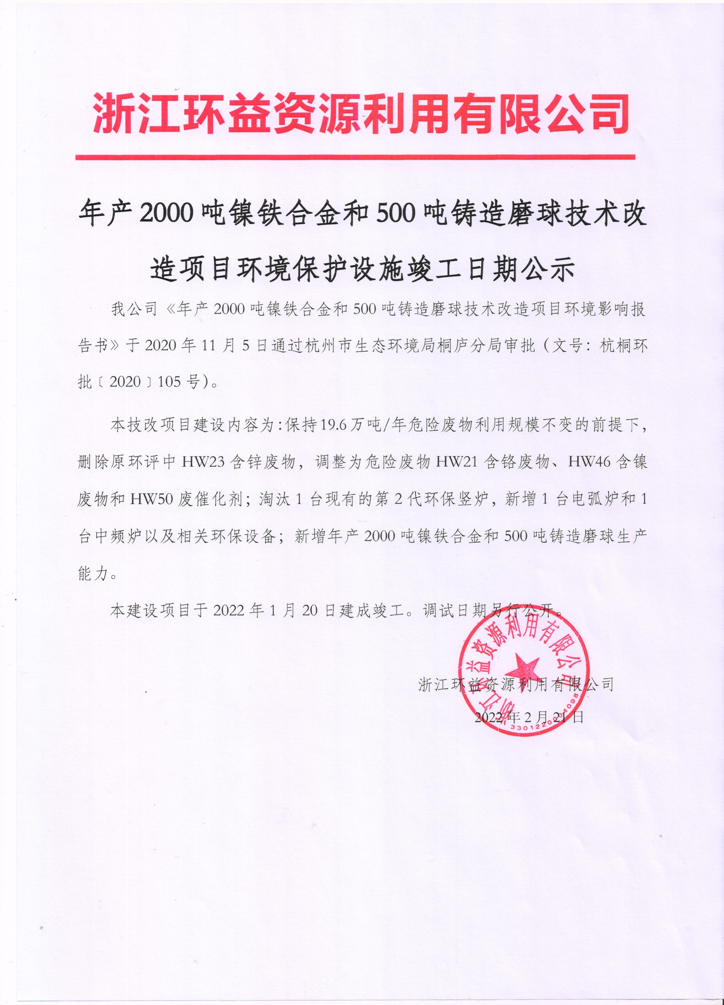 年产2000吨镍铁合金和500吨铸造磨球技术改造项目环境保护设施竣工日期公示